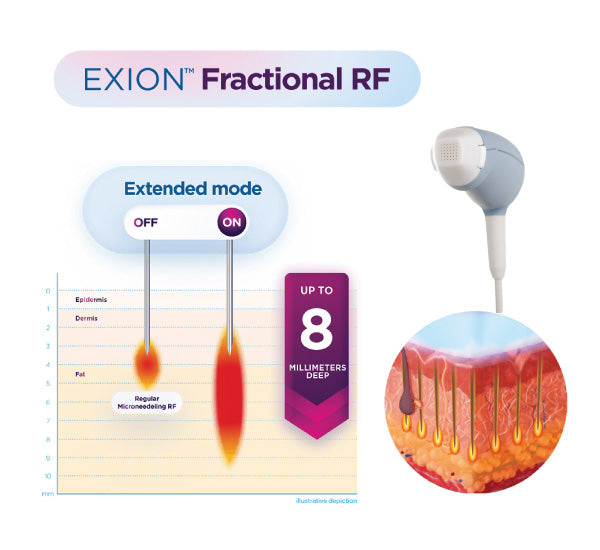 The Extended Mode delivers energy beyond the microneedle penetration depth, reaching deeper layers while minimizing pain.
